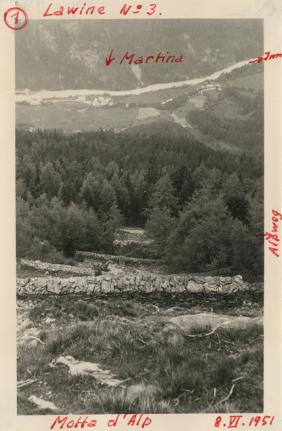 Auf dem folgenden Bild sind die Motta d’Alp-Lawinenverbauungen 1951 inkl. handschriftlicher Notizen zur Geografie zu sehen. Das Foto wird uns vom Staatsarchiv Graubünden zur Verfügung gestellt.